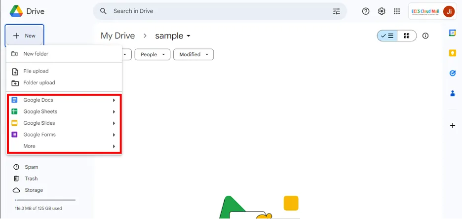 To proceed with the following steps, make sure you are already logged into ECCS Cloud Mail and have Google Drive open in your browser. If you have not completed these two steps, please refer to “Open Google Drive in the browser” on the Google Drive page (an English translation is planned).