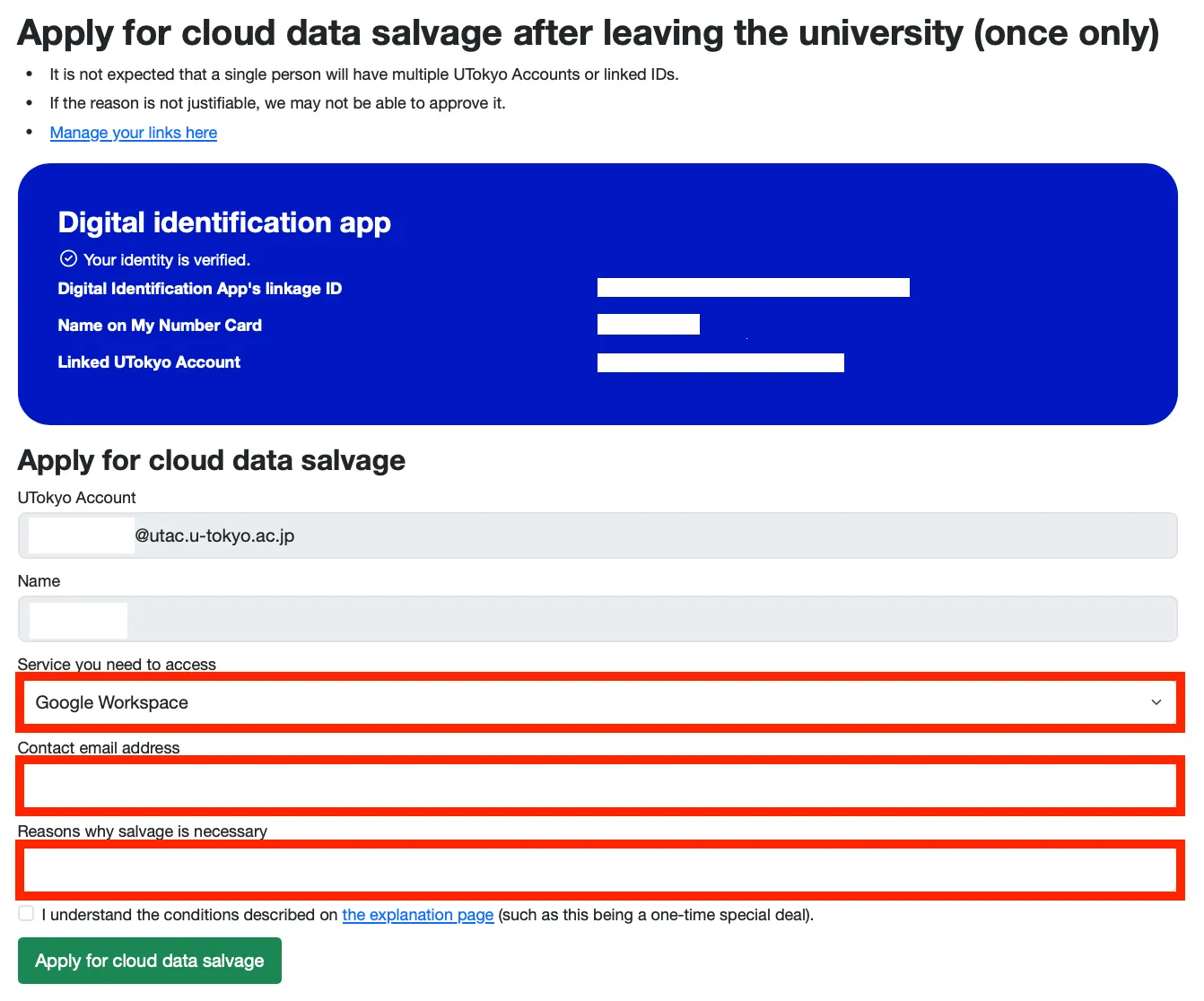 If you wish to apply for cloud data salvaging, please do so through the “UTokyo Account Identity Verification Service”.