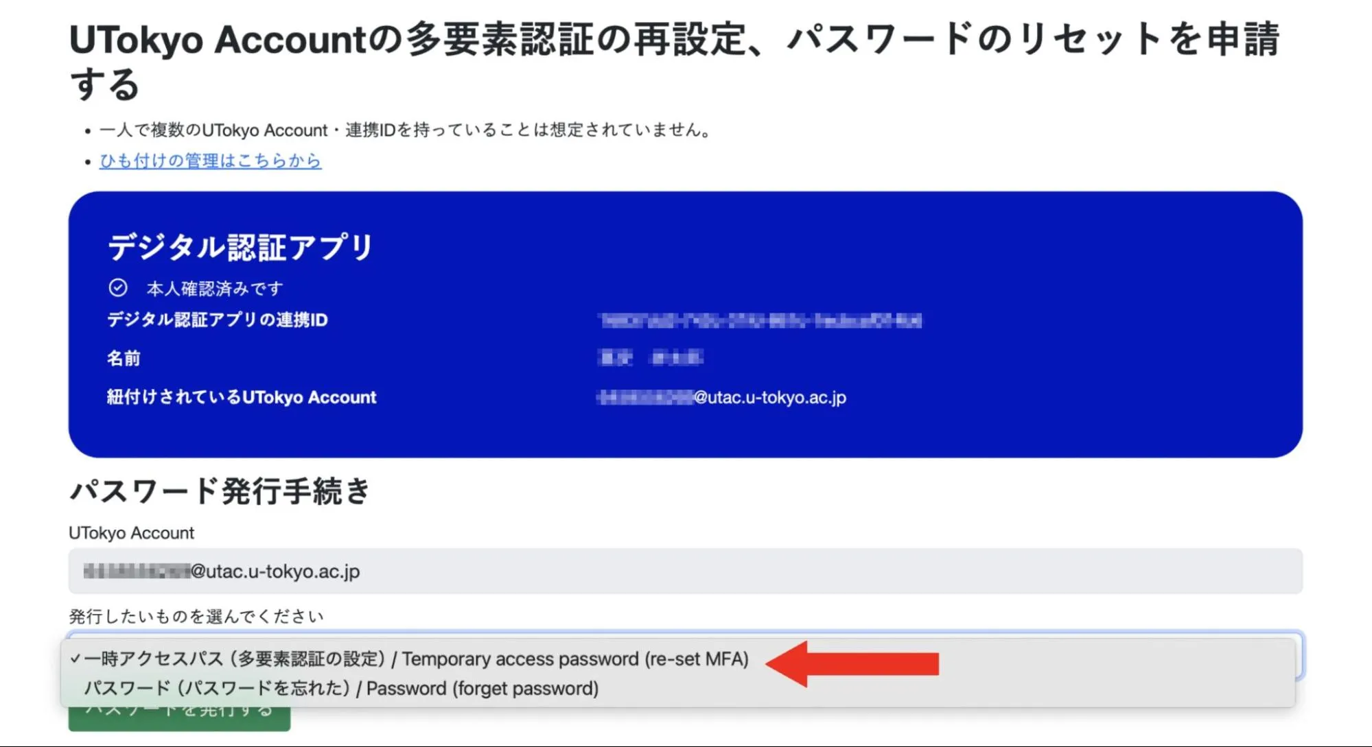 - Click “Request to reset multi-factor authentication and password for your UTokyo Account”