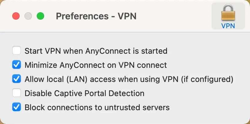 When you are connected to UTokyo VPN, the communication to the local network to which your computer is connected also goes through the VPN. Click the gear button on the bottom left of the AnyConnect Secure Mobility Client window. The following window will appear. In the “Preferences” tab of this window, check the “Allow local (LAN) access when using VPN (if configured)” check box.