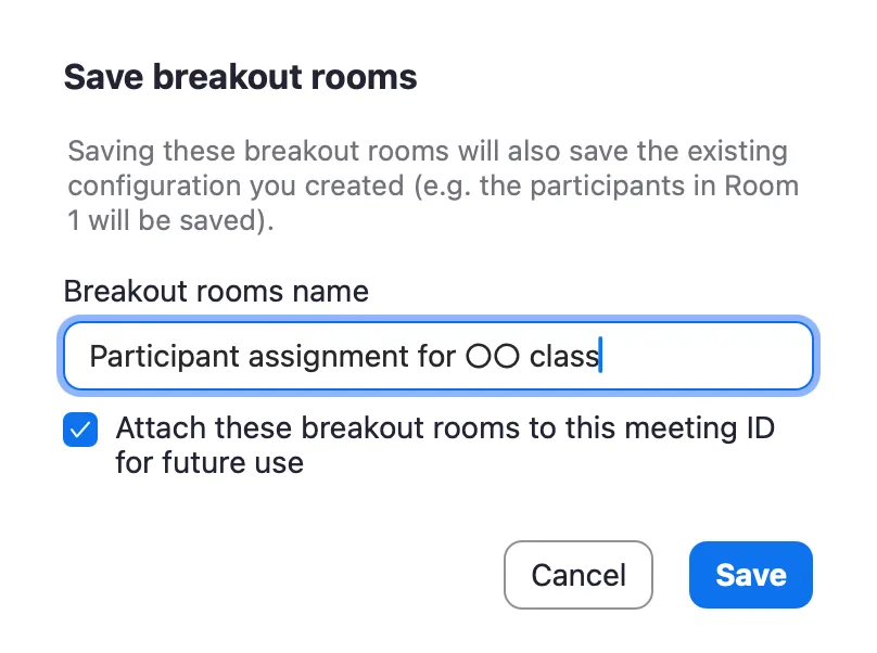 In a standard meeting, you need to assign participants to breakout rooms every time. However, for recurring meetings, you can save the current breakout room assignment for future use. Up to 10 different assignments can be saved per user. The steps to save a participant assignment are as follows: