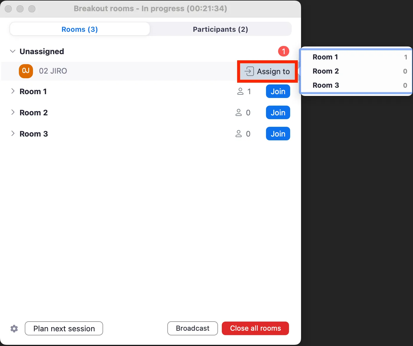 Please note that after the breakout session starts, an “Unassigned” item may appear on the host’s or co-host’s screen. Participants whose names are here remain in the main meeting without being assigned to any room. To assign them, hover over their name, click the “Assign to” which appears, and select the room for the unassigned participant to join.