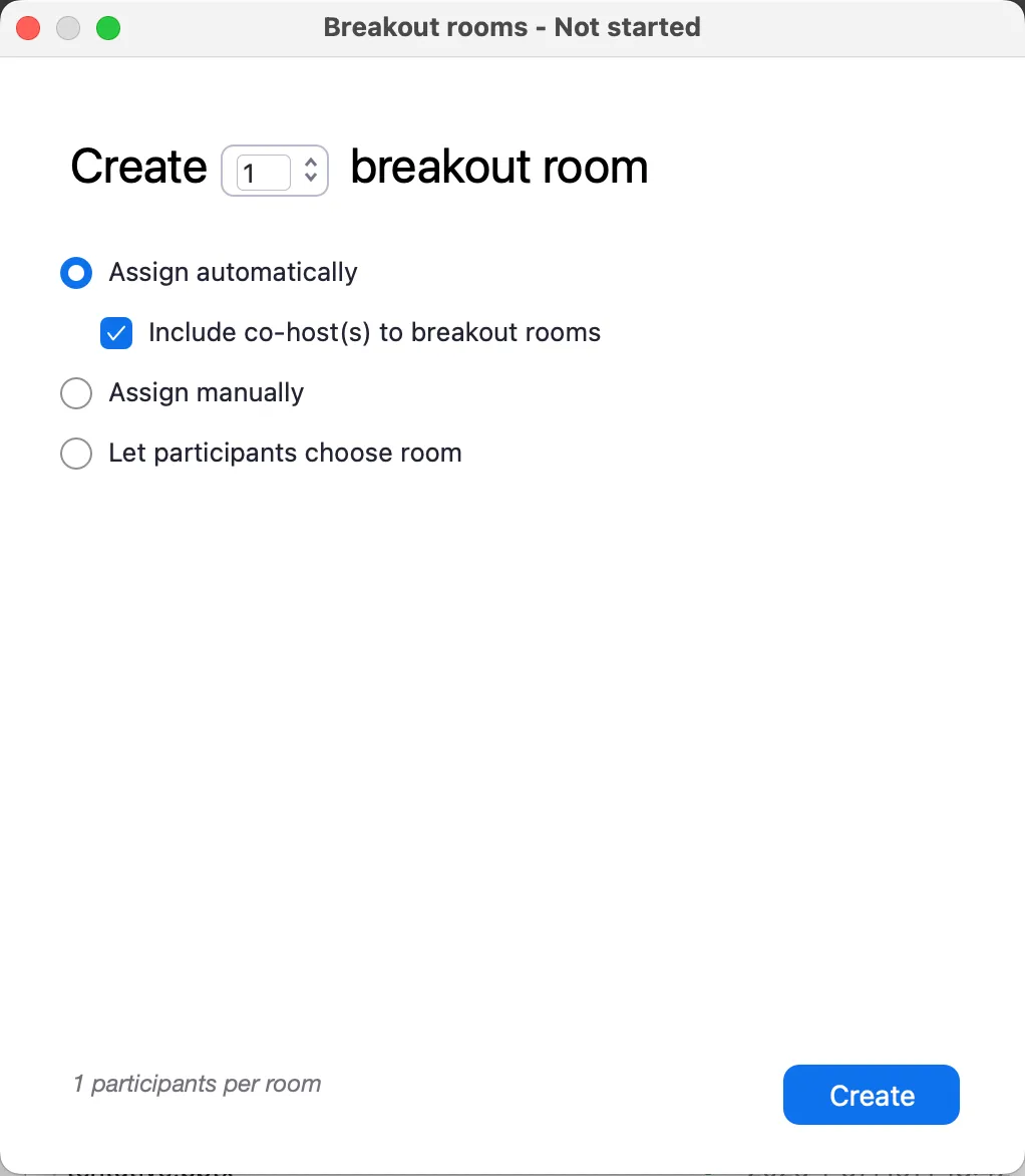 To start a breakout session, first enter the number of breakout rooms needed and choose how to assign participants to each room. The number of rooms can be changed later.