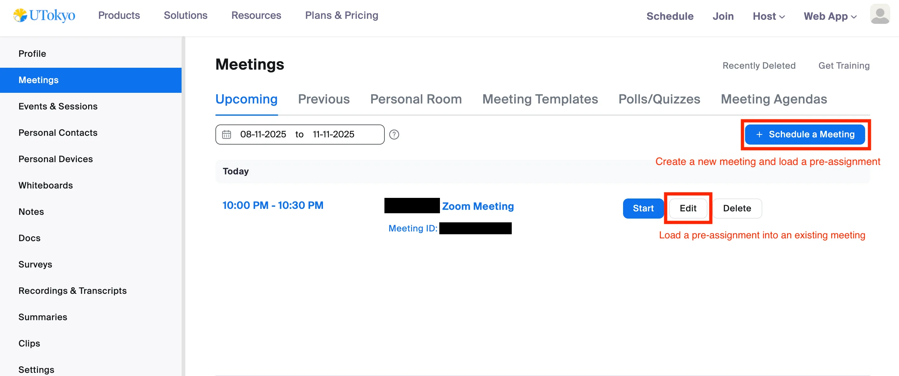 2. Open “Upcoming” in the “Meetings” section. Schedule a new meeting by clicking “Schedule a Meeting”, or for an existing meeting, hover over it and click “Edit”, then “Edit Entire Series”.