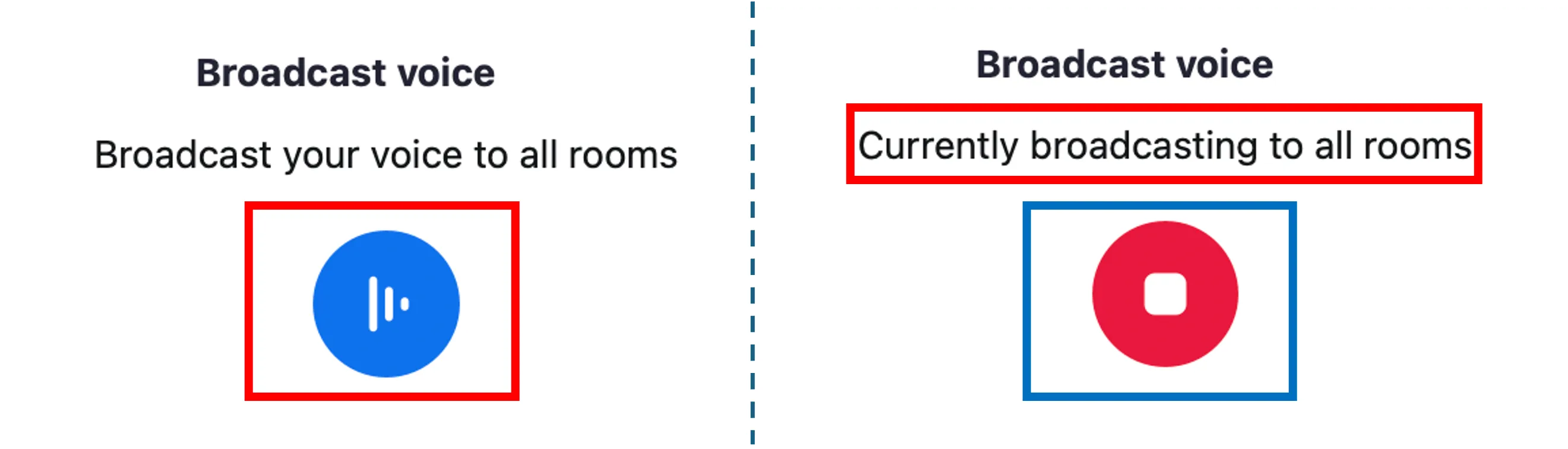 • To broadcast voice: After confirming you are unmuted, click the broadcast voice icon (the icon in the left red box in the figure). When “Currently broadcasting to all rooms” is displayed, you are broadcasting correctly. To stop broadcasting, click the stop icon (in the blue box).