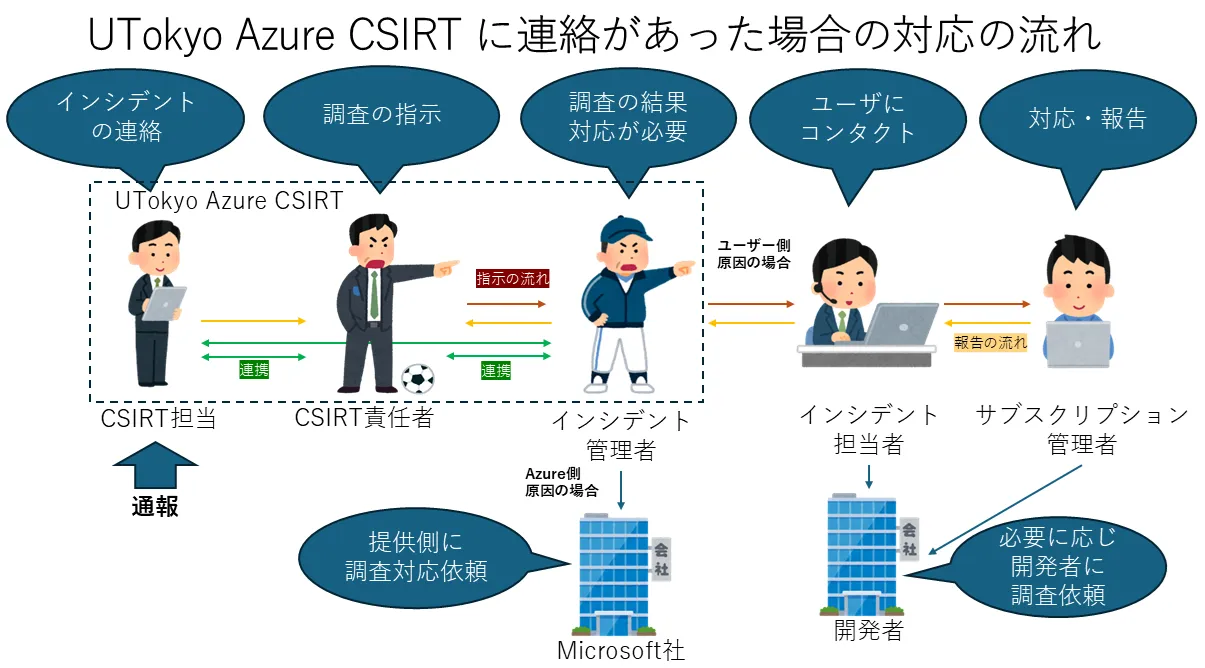 通報者は通常,インシデントを受けた場合に送信元のIPアドレスやドメインのインシデント連絡先等を見て通報するため、利用者がどのように Azure サービスを利用していたかによっては,必ずしも UTokyo Azure CSIRT 経由でインシデントの通報を行うとは限らず,部局CERTやサブスクリプション管理者,システムの担当者に直接連絡が行く可能性もあります. その場合は,主には部局CERTに報告を上げて,以後どのように対応するべきかご相談ください.