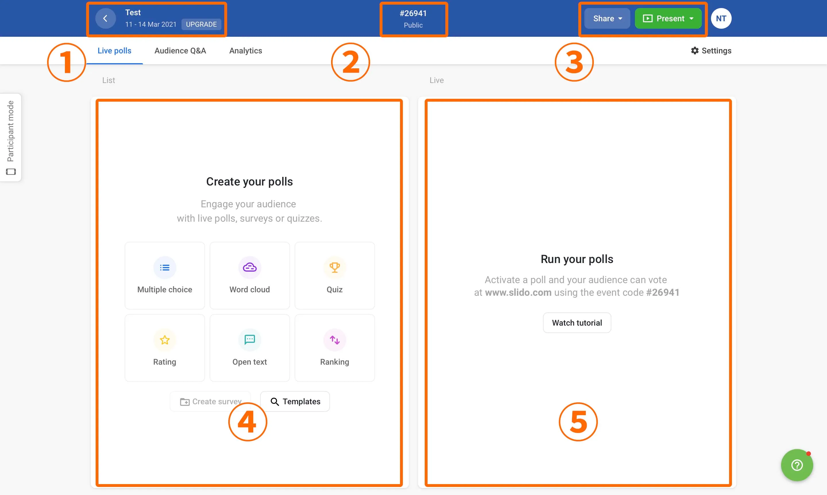Slidoでは,投票(polls)機能を使うことで,教員から学生に対して質問やクイズを行うことができます. 画面左上の「Live polls」を選択してください.