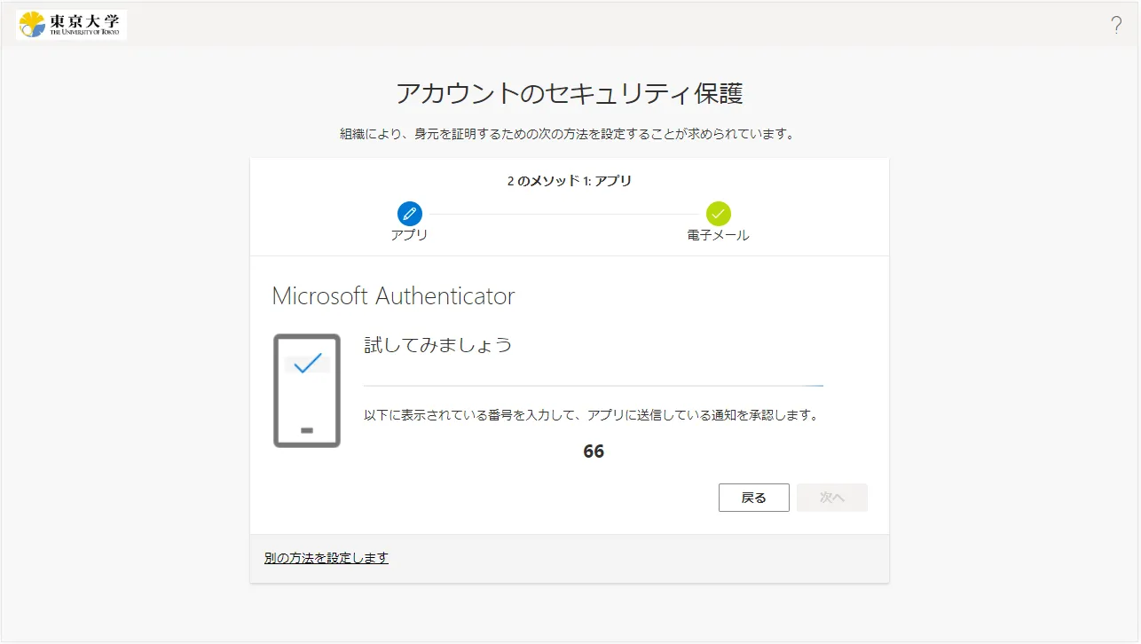 - Microsoft Authenticatorの場合:スマホに通知が送られ,サインイン画面に表示されている2桁の数字を入力するように求められるので,そのようにしてください.