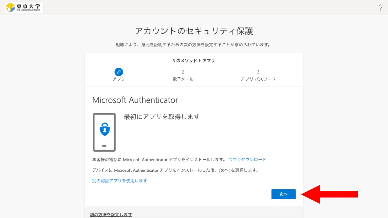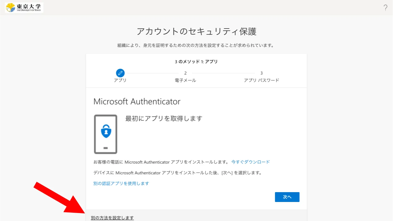 多要素認証の本人確認方法を設定する画面になります.デフォルトでMicrosoft Authenticatorの設定をする画面になっているので,そのまま「次へ」を押してください.