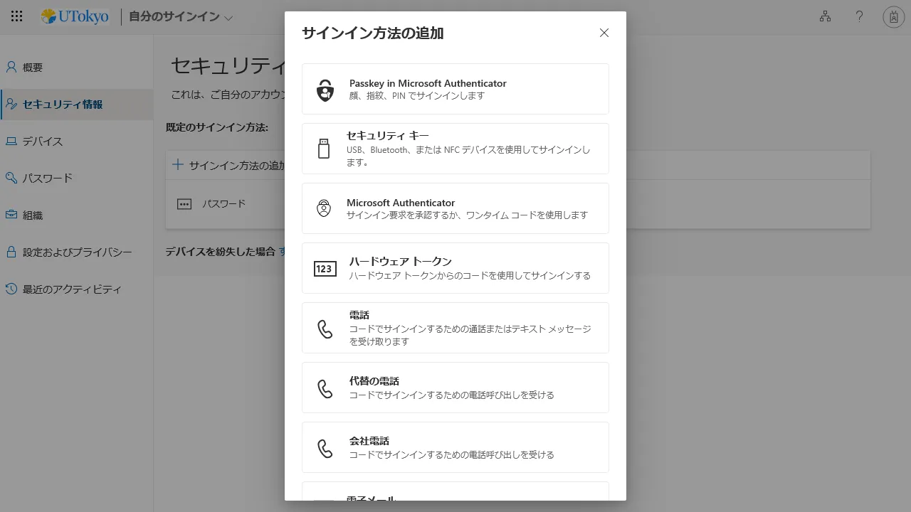 FIDOセキュリティキーと呼ばれる専用の機器を用いて本人確認を行う方法です.一部のシステムでは対応していないため,他の本人確認方法を登録した上で,2個目以降の本人確認方法として利用してください.詳細は「UTokyo Account多要素認証におけるFIDOセキュリティキーの利用方法」をご覧ください.
