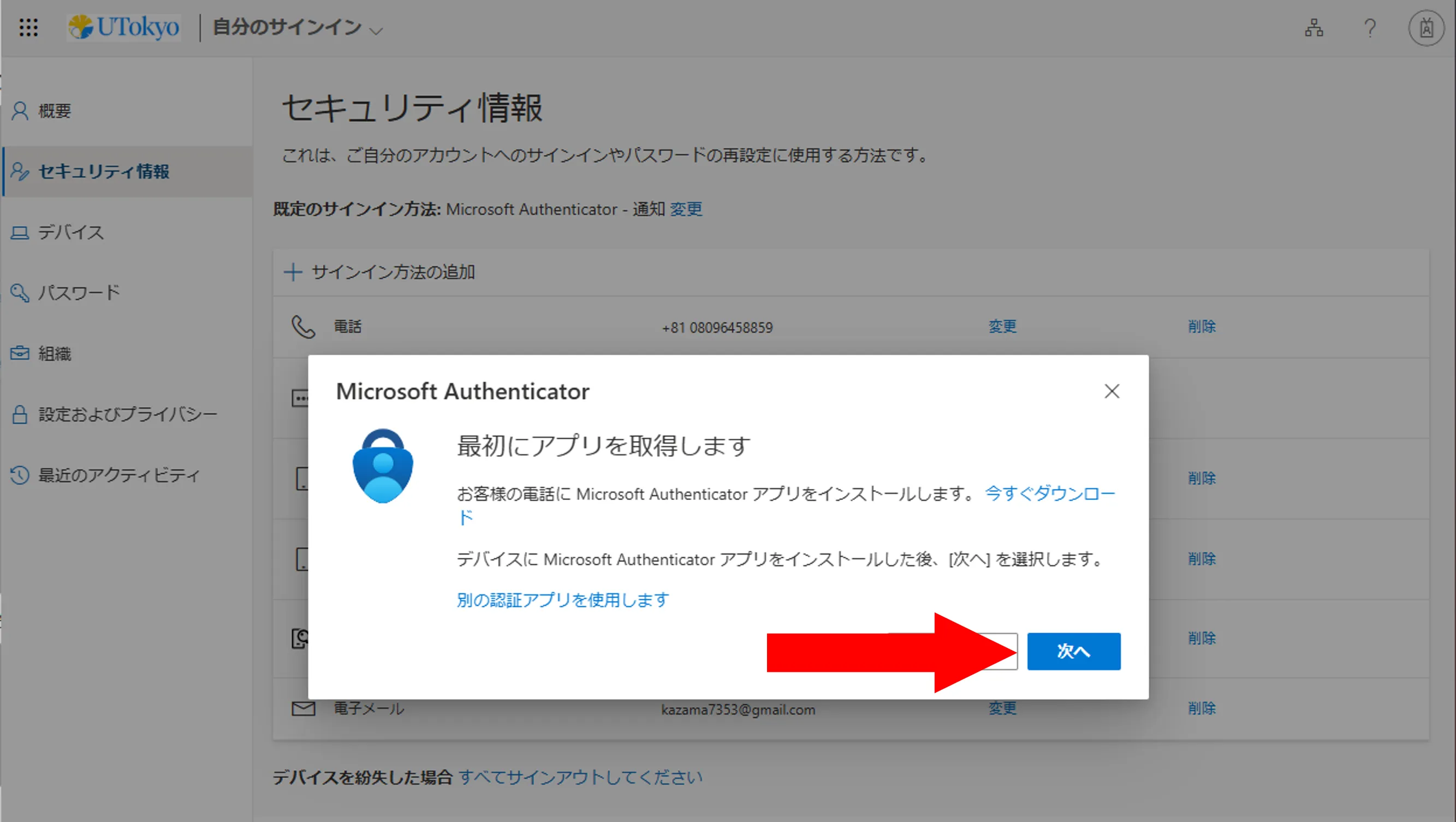 @utac.u-tokyo.ac.jp)とパスワードを入力してください. - 「詳細情報が必要」という画面が表示されるので,「次へ」を押してください.