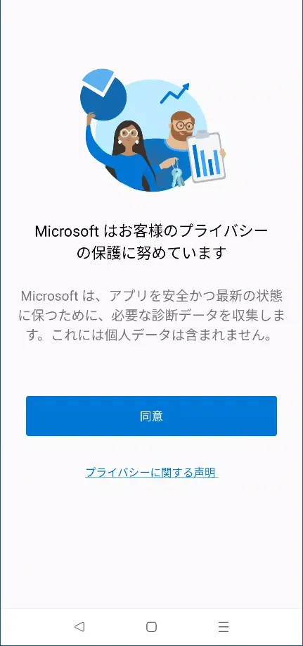 - スマホでMicrosoft Authenticatorアプリを起動してください.なおこの際,インストール後初めてアプリを起動したという場合は,プライバシーに関する事項の同意やデータ収集に関する設定の確認が求められますので,順に進めてください.