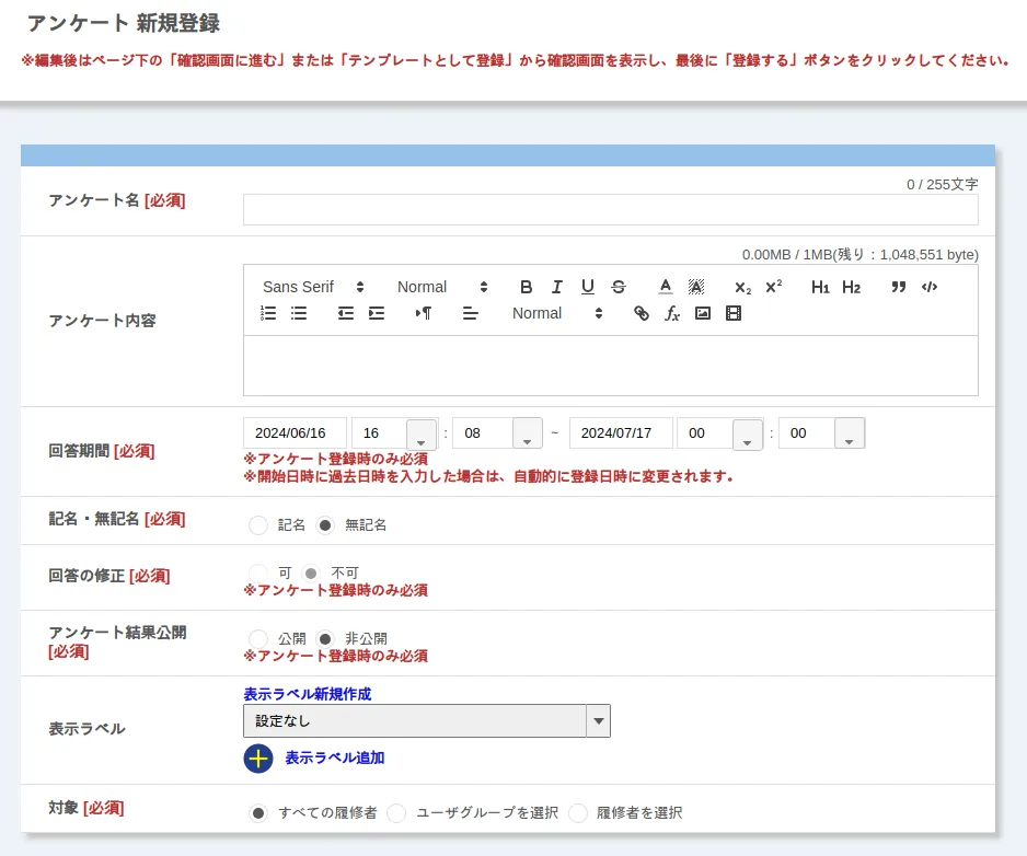 • テンプレートを編集する場合:表示されている設定項目を編集してください.編集できるのは,テンプレートのタイトルと設問のみです.「新規登録」画面や「編集」画面で表示されていたその他の項目は,テンプレートに含まれないため編集できません.